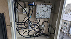 けやの高台で海風が強いところです。屋上のアンテナは5から6メーターの高さで建っていたようでビル用の材料が使われていました。アンテナの受信方向は可也山の糸島局になります。BS放送と混合して中に流します。宅内の情報版でビル用のブースターに電波が入りますので電波の調整をして分配器に流します。後は画像確認をして工事完了です。
