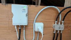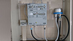 糸島局か福岡局のどちらか決めます。今回はお客様のご希望で屋内に取り付けです。測定器で糸島局のレベルを測り、取り付け場所を決めブースターも取り付けます。出力調整をして工事完了です。